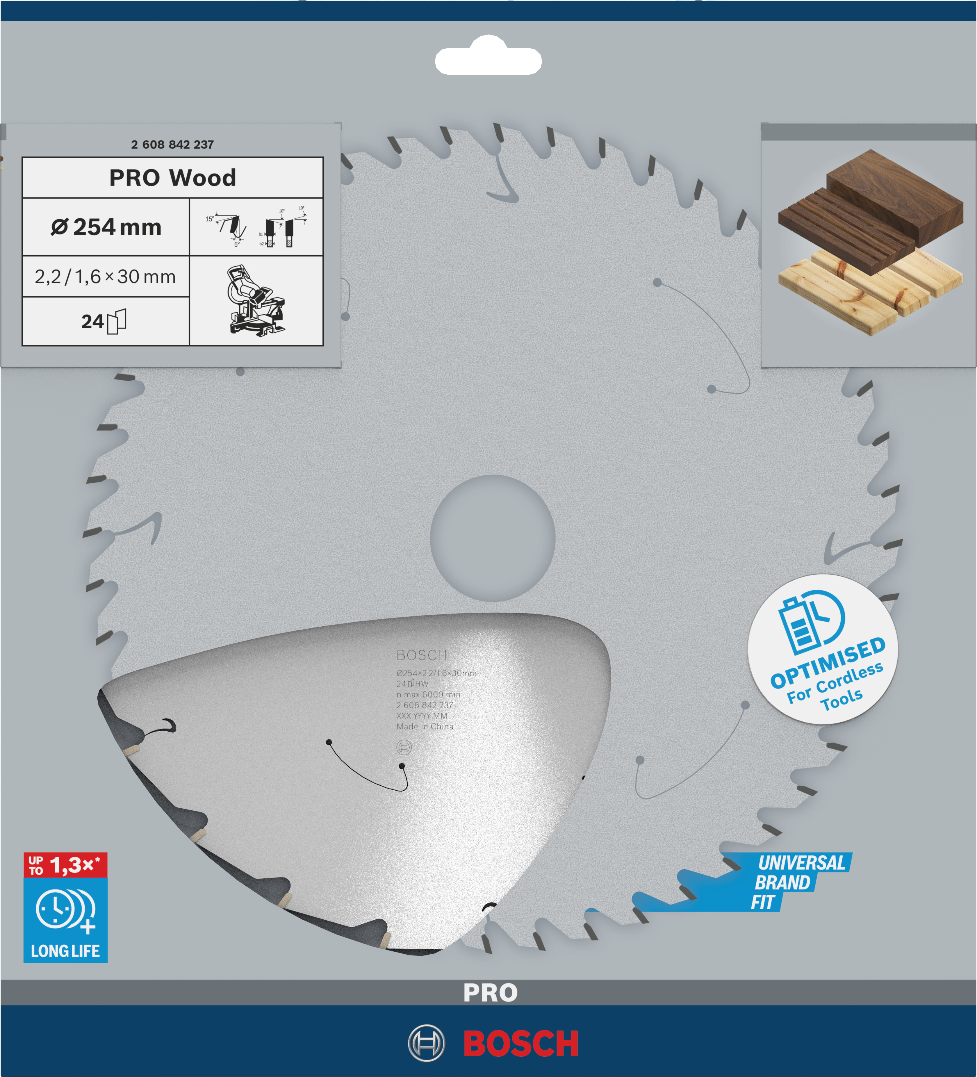 Emballage: 1Marque: BoschRéférence: 2608842237EAN: 4059952634241Description: Lame scie Circulaire à onglets Sans-fil PRO Bois 254x30x2,2mm ; 24D