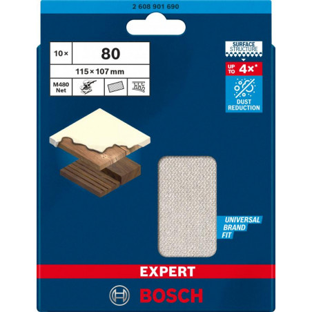 Emballage: 10 Marque: Bosch Référence: 2608901690 EAN: 4059952644462 Description: EXPERT abrasif M480 Best for Wood and Paint, 115 x 107 mm, grain 80, 10x