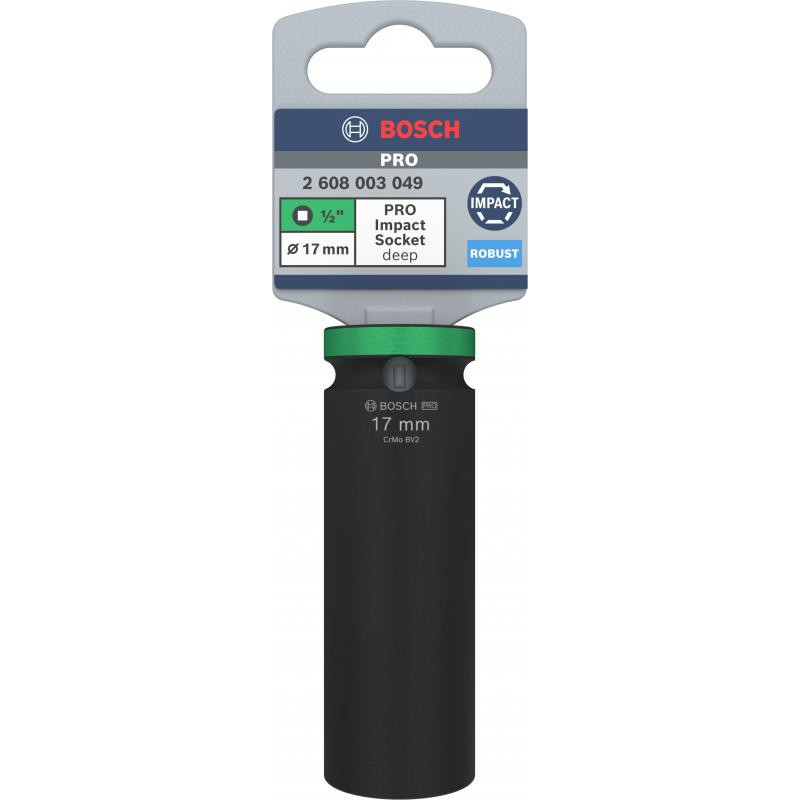 Emballage: 1Marque: BoschRéférence: 2608003049EAN: 6949509246868Description: Douille Impact PRO M17 77MM 1/2''