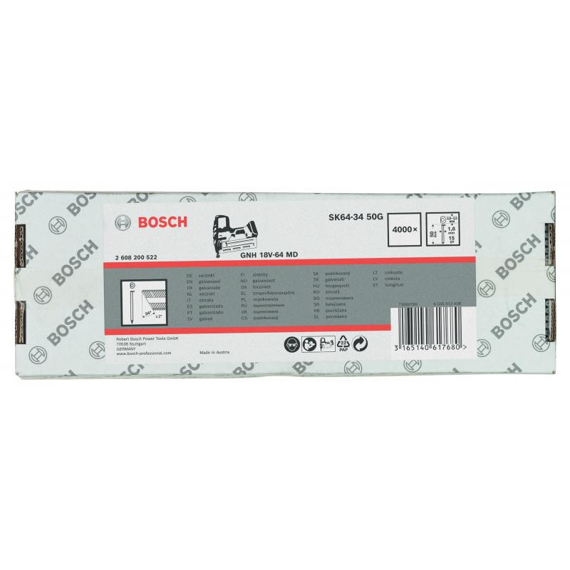 Emballage: 4000Marque: BoschRéférence: 2608200522EAN: 3165140617680Description: Pointe à tête fraisée SK64- 1,8 x 34 x 50 mm, galvanisés 4000x