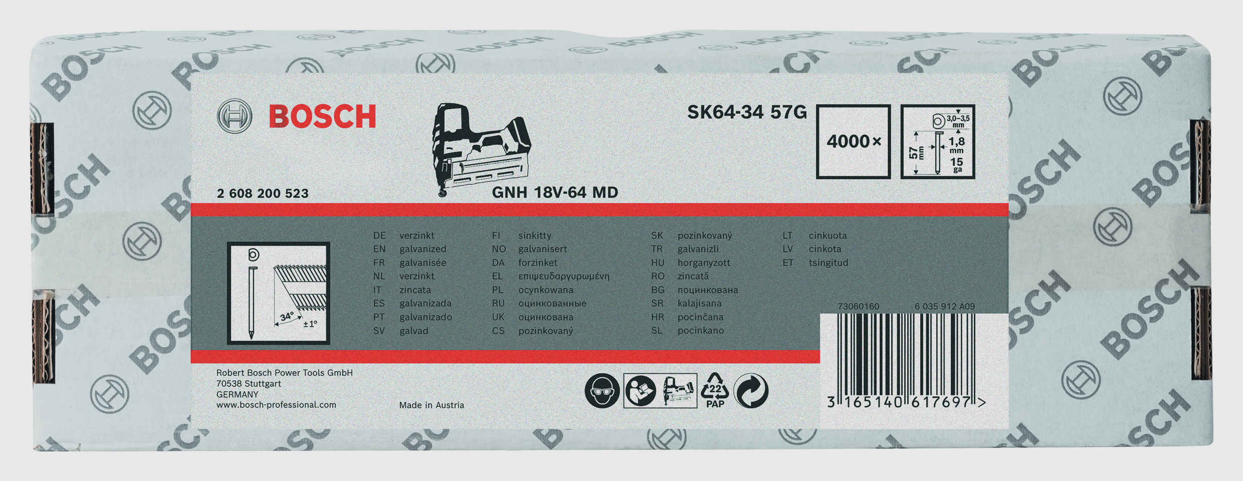 Emballage: 4000Marque: BoschRéférence: 2608200523EAN: 3165140617697Description: Pointe à tête fraisée SK64- 1,8 x 34 x 57 mm, galvanisés 4000x