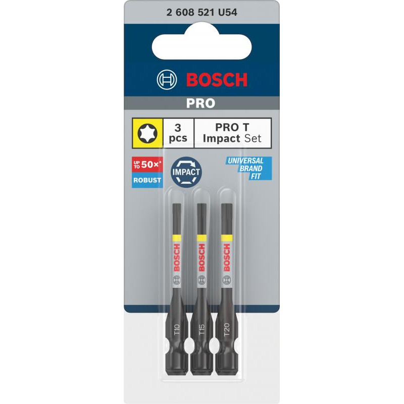 Emballage: 3Marque: BoschRéférence: 2608521U54EAN: 6949509242037Description: 3 Embouts de vissage PRO Impact T10 T15 T20 55 mm