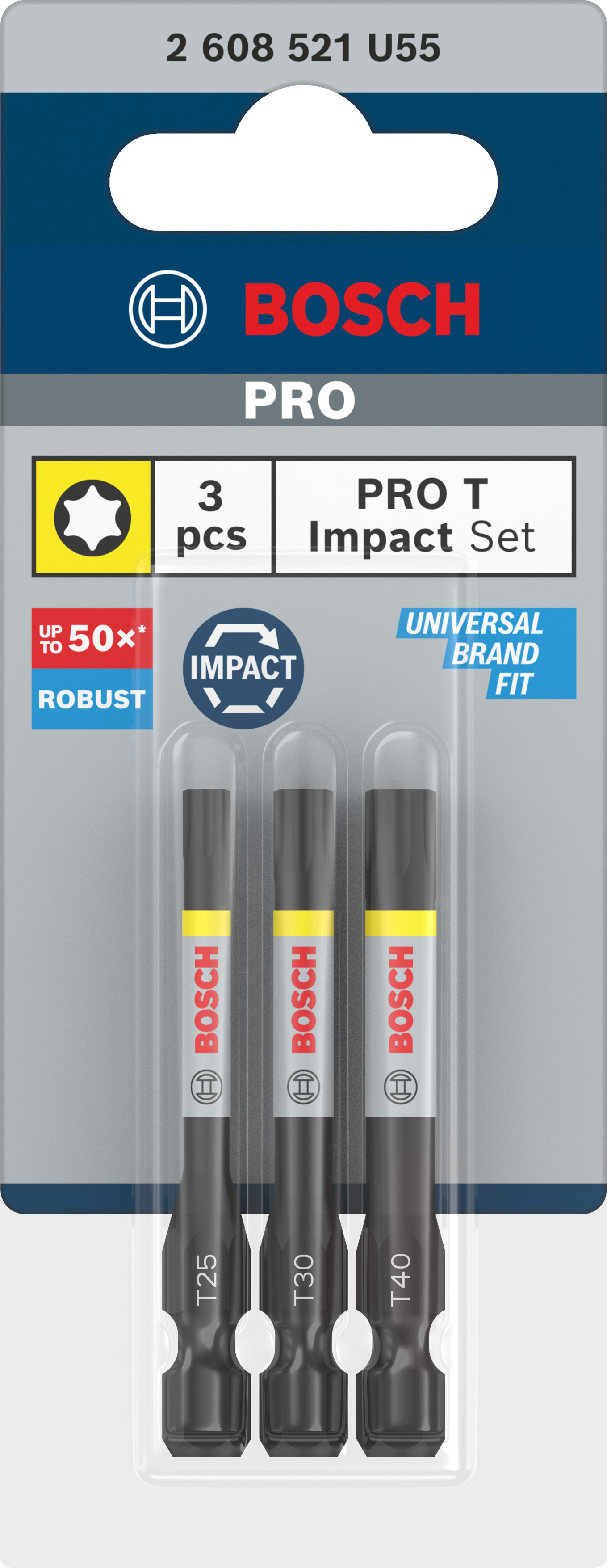 Emballage: 3Marque: BoschRéférence: 2608521U55EAN: 6949509242044Description: 3 Embouts de vissage PRO Impact T25 T30 T40 55 mm