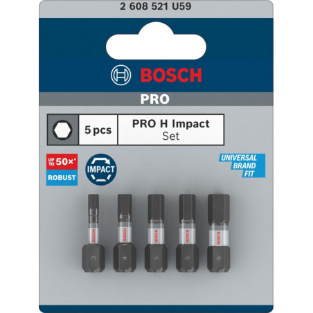 Emballage: 5Marque: BoschRéférence: 2608521U59EAN: 6949509242310Description: 5 Embouts de vissage PRO Impact H3 H4 H5(x2) H6 25 mm