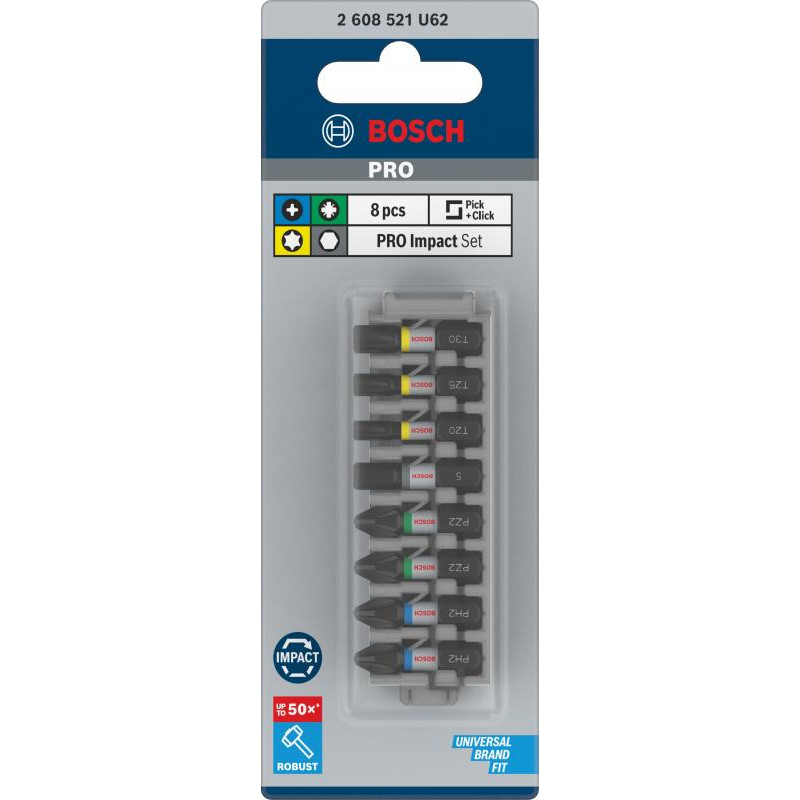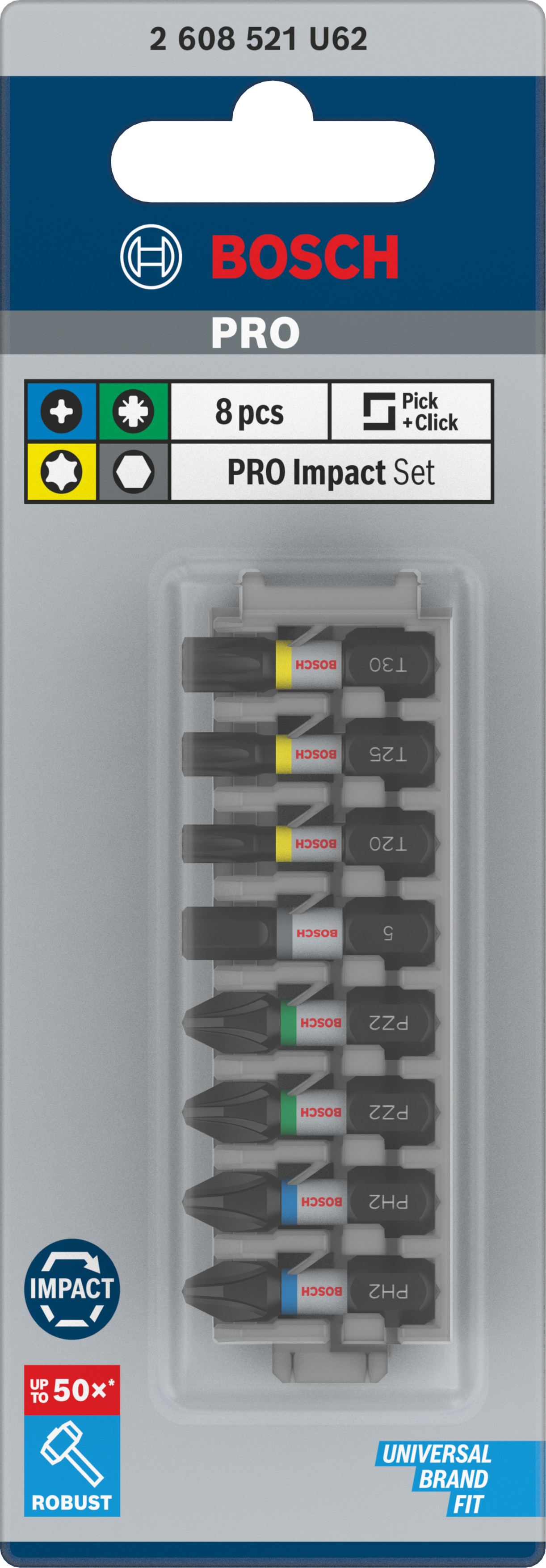 Emballage: 8Marque: BoschRéférence: 2608521U62EAN: 6949509242358Description: 8 Embouts de vissage PRO Impact PH2(x2) PZ2(x2) H5 T20 T25 T30 25 mm
