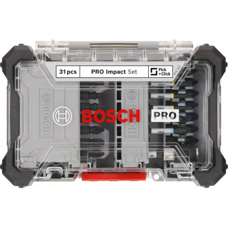 Emballage: 31Marque: BoschRéférence: 2608521U71EAN: 6949509242518Description: Coffret Vissage PRO Impact 31 pcs avec présentoir à commander par 6 pcs