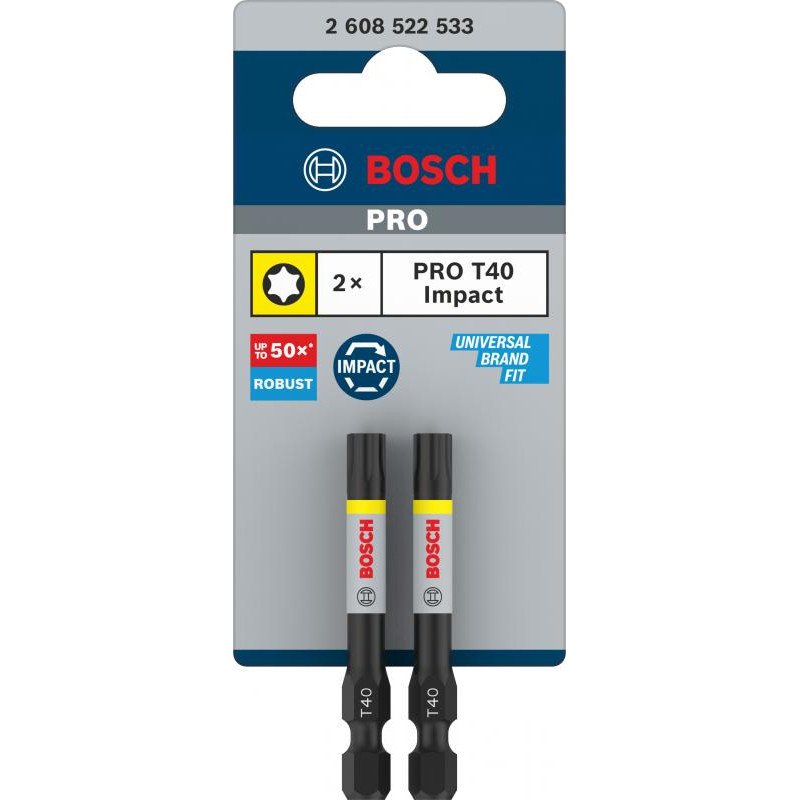 Emballage: 2Marque: BoschRéférence: 2608522533EAN: 6949509242020Description: 2 Embouts de vissage PRO Impact T40 55 mm