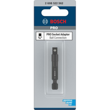 Emballage: 1Marque: BoschRéférence: 2608522562EAN: 6949509242488Description: Adaptateur PRO pour douilles Impact avec bille 1/4 50 mm