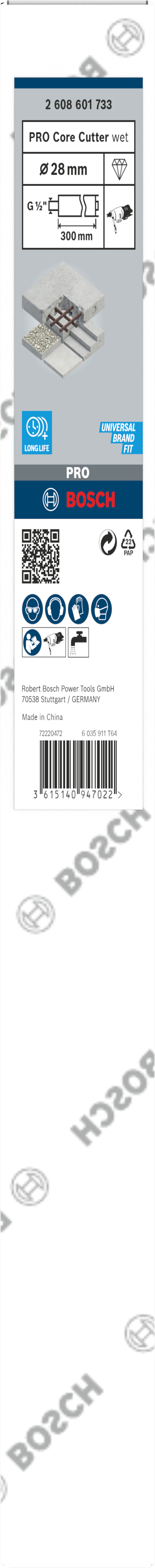 Emballage: 1Marque: BoschRéférence: 2608601733EAN: 3165140947022Description: Couronne diamant à eau PRO, 28x300 mm, G 1/2-Inch