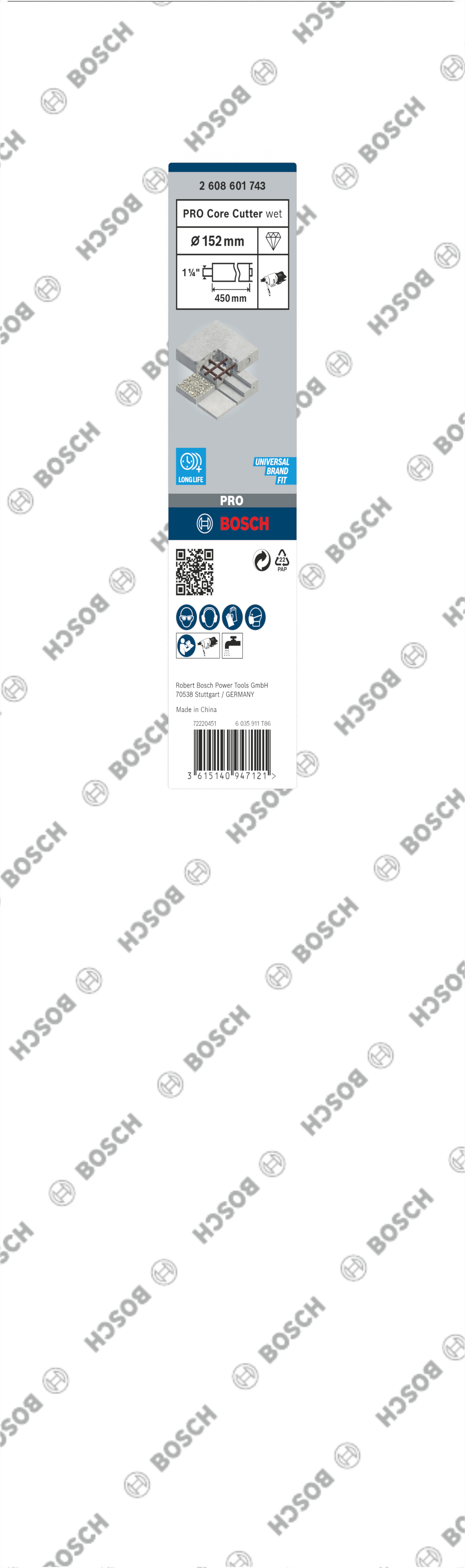 Emballage: 1Marque: BoschRéférence: 2608601743EAN: 3165140947121Description: Couronne diamant à eau PRO, 152x450 mm, 1 1/4-Inch UNC