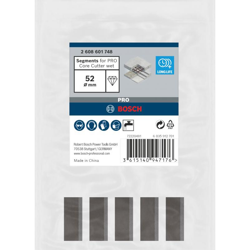 Emballage: 1Marque: BoschRéférence: 2608601748EAN: 3165140947176Description: Couronne diamant à eau PRO, 52x10,0 mm, 1 1/4-Inch UNC Segment