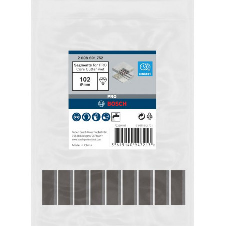 Emballage: 1Marque: BoschRéférence: 2608601752EAN: 3165140947213Description: Couronne diamant à eau PRO, 102x10,0 mm, 1 1/4-Inch UNC Segment