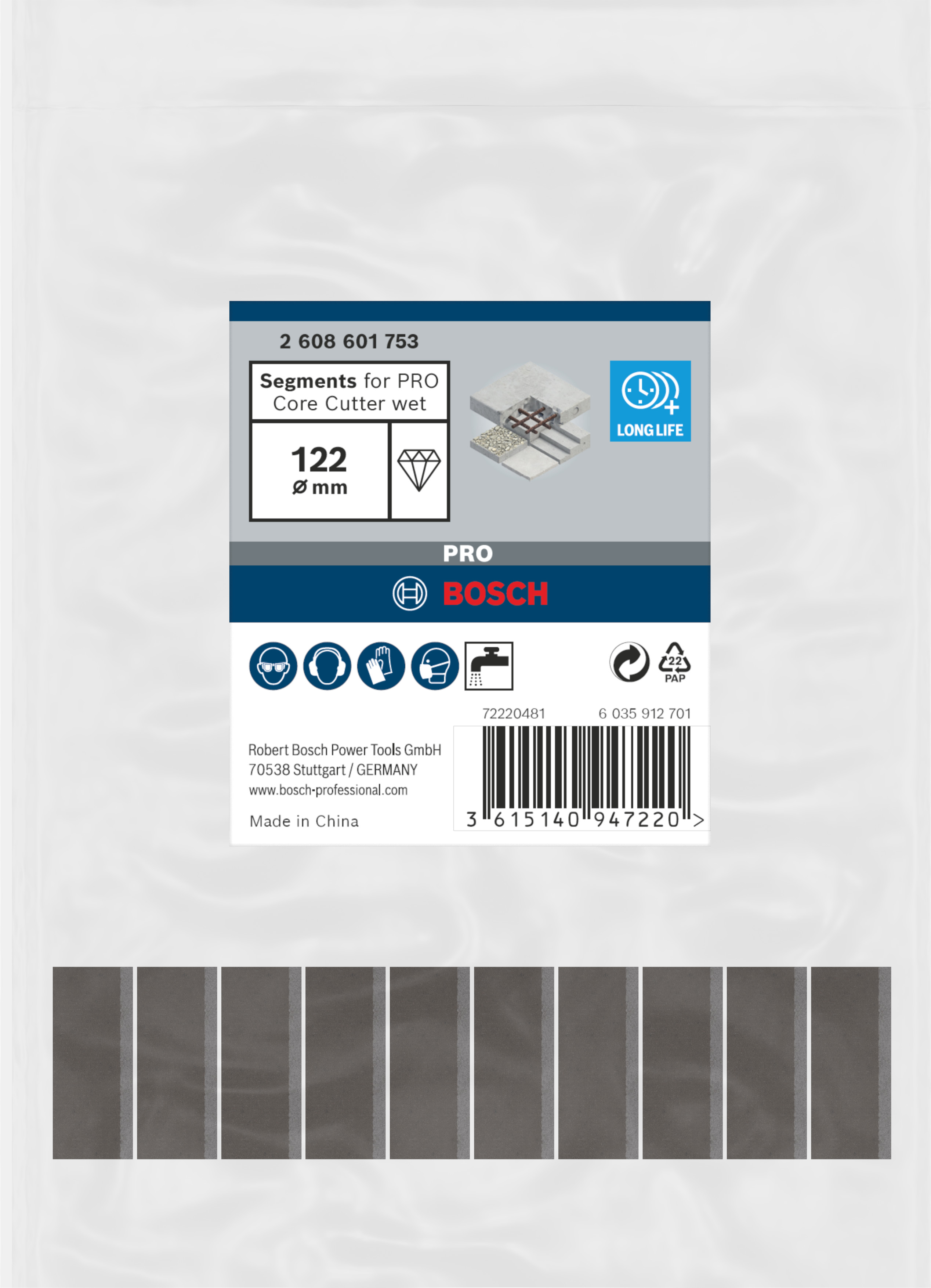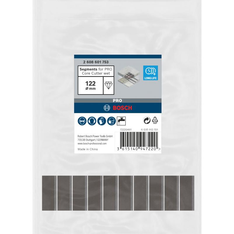 Emballage: 1Marque: BoschRéférence: 2608601753EAN: 3165140947220Description: Couronne diamant à eau PRO, 122x10,0 mm, 1 1/4-Inch UNC Segment