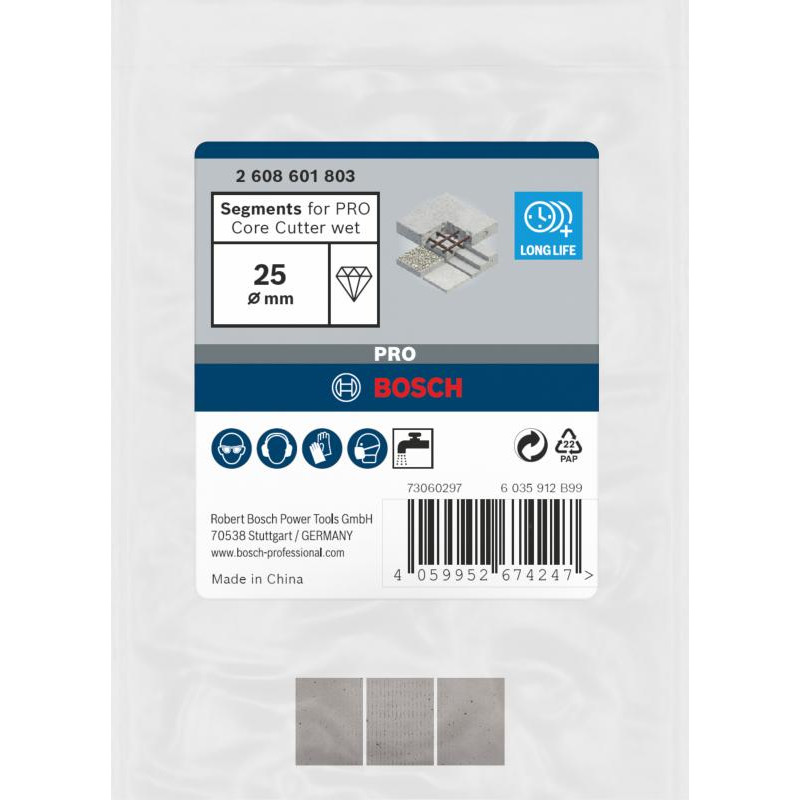 Emballage: 1Marque: BoschRéférence: 2608601803EAN: 4059952674247Description: Couronne diamant à eau PRO, 25 mm, 1 1/4-Inch UNC Segment