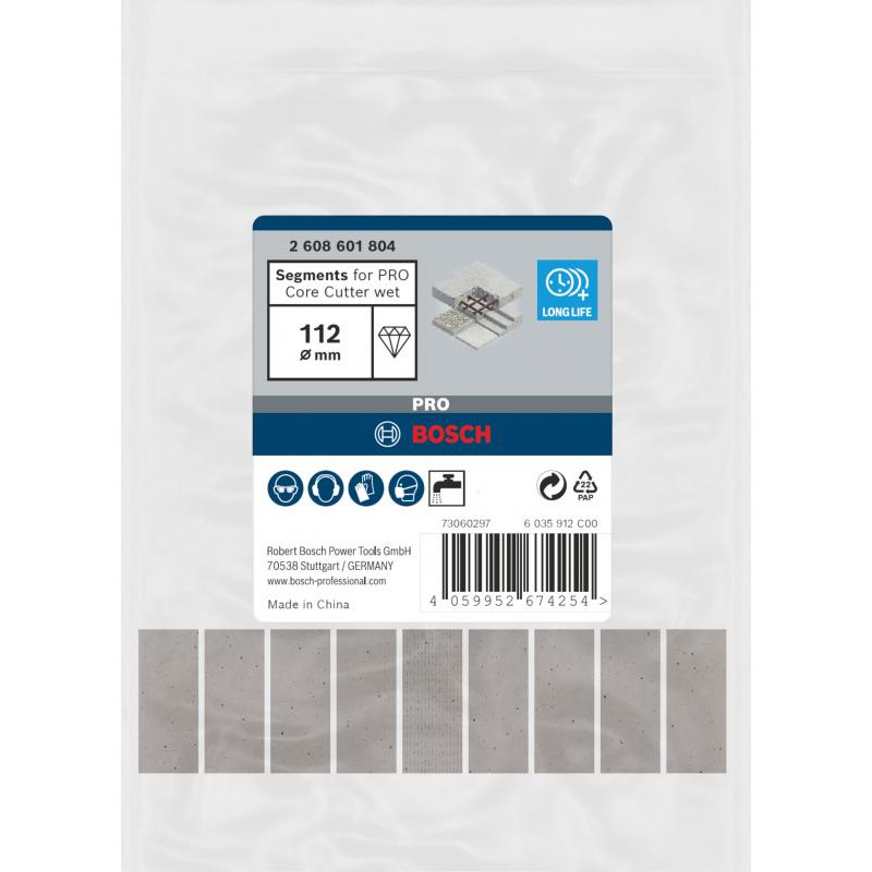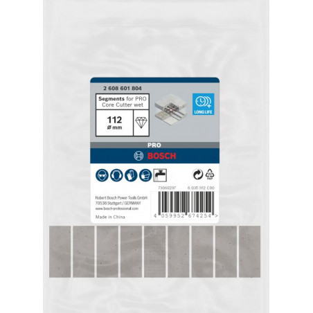 Emballage: 1Marque: BoschRéférence: 2608601804EAN: 4059952674254Description: Couronne diamant à eau PRO, 112 mm, 1 1/4-Inch UNC Segment