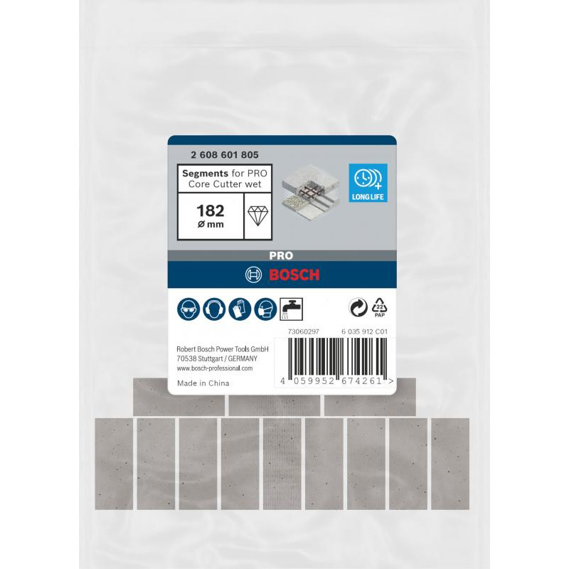 Emballage: 1Marque: BoschRéférence: 2608601805EAN: 4059952674261Description: Couronne diamant à eau PRO, 182 mm, 1 1/4-Inch UNC Segment