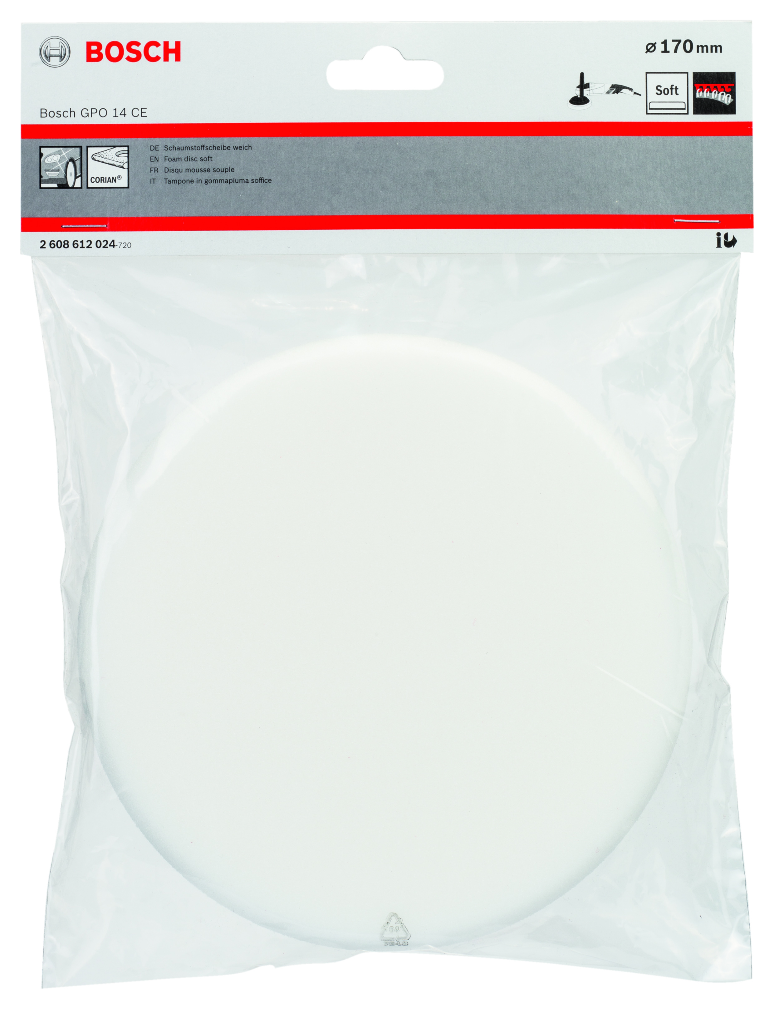 Emballage: 1Marque: BoschRéférence: 2608612024EAN: 3165140632409Description: Disque mousse souple (blanc), Ø 170 mm