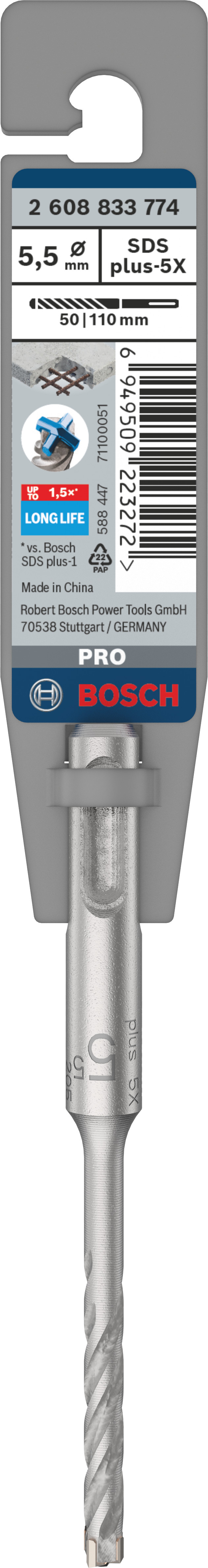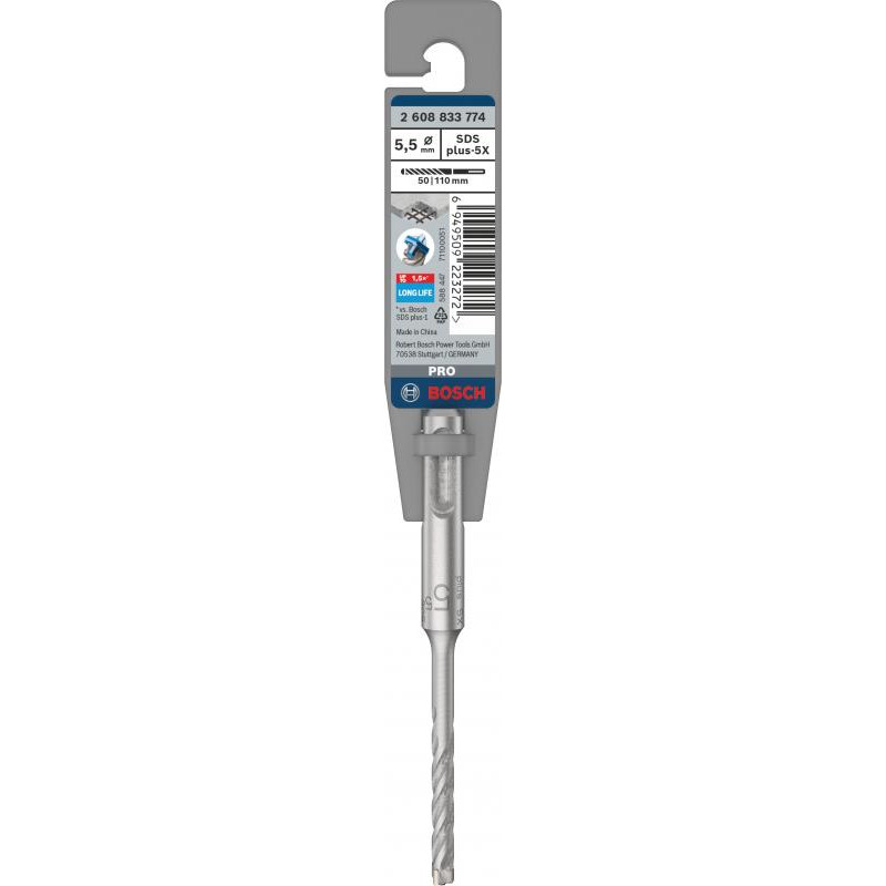Emballage: 1Marque: BoschRéférence: 2608833774EAN: 6949509223272Description: Foret beton PRO SDS plus-5X 5,5x50x110 mm