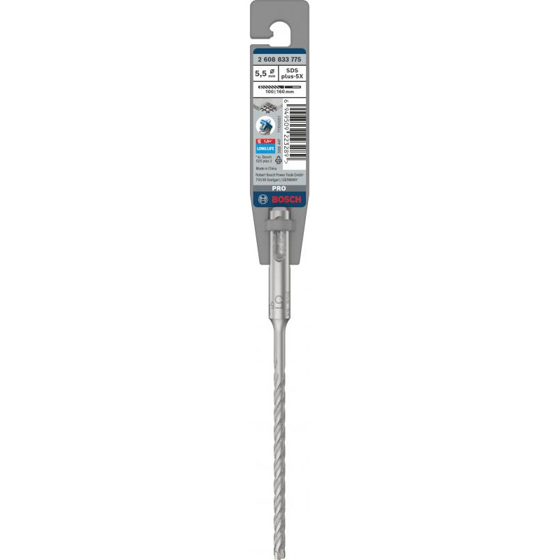 Emballage: 1Marque: BoschRéférence: 2608833775EAN: 6949509223289Description: Foret beton PRO SDS plus-5X 5,5x100x160 mm
