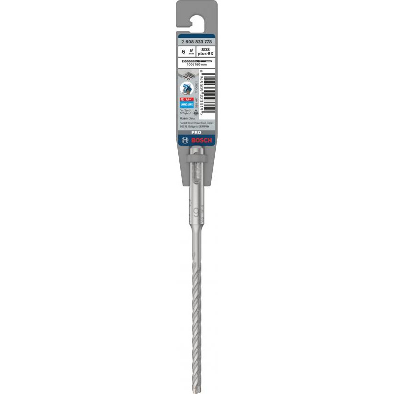 Emballage: 1Marque: BoschRéférence: 2608833778EAN: 6949509223319Description: Foret beton PRO SDS plus-5X 6x100x160 mm