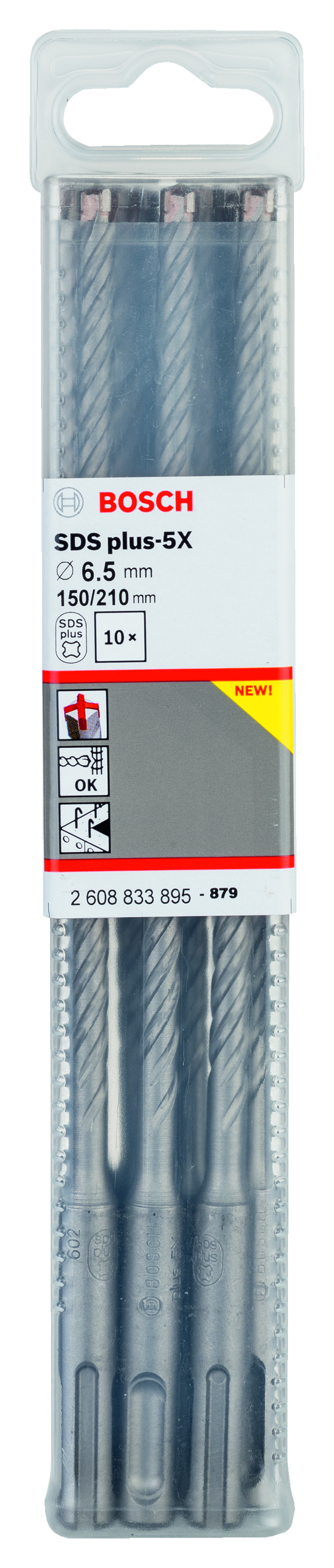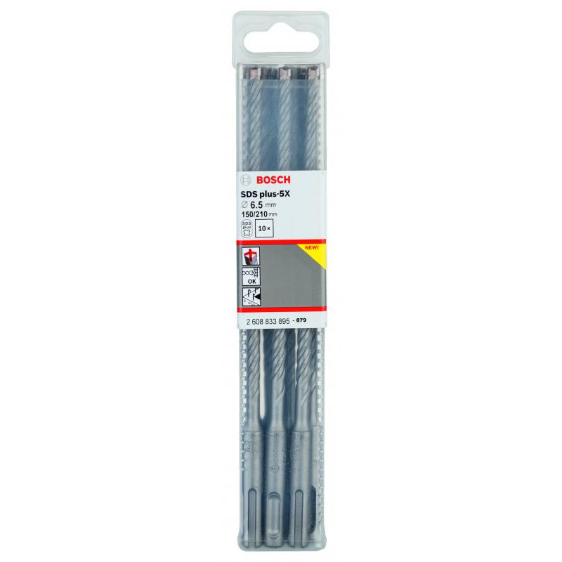 Emballage: 10Marque: BoschRéférence: 2608833895EAN: 6949509223890Description: 10 Foret bet PRO SDS plus-5X 6.5x150x210 mm