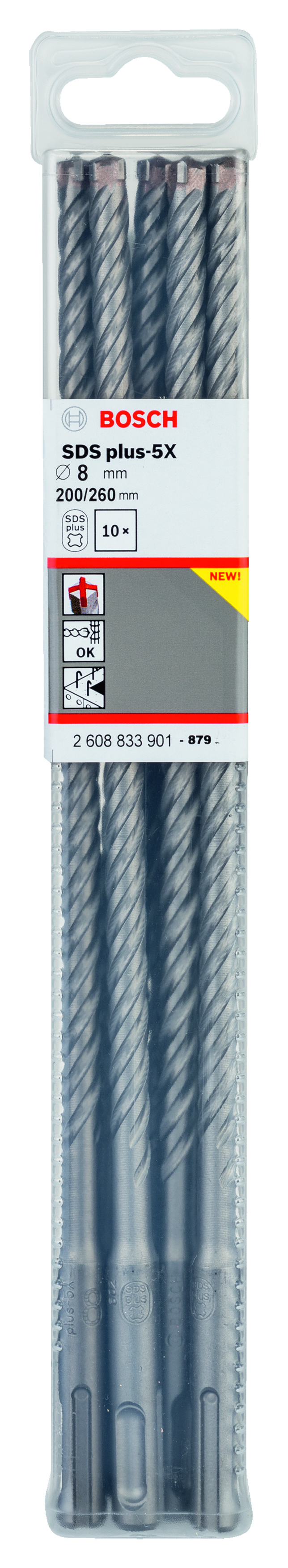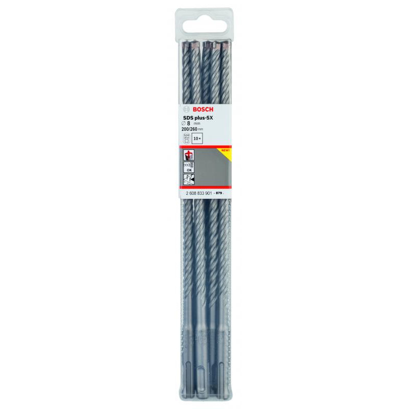 Emballage: 10Marque: BoschRéférence: 2608833901EAN: 6949509223951Description: 10 Foret bet PRO SDS plus-5X 8x200x260 mm