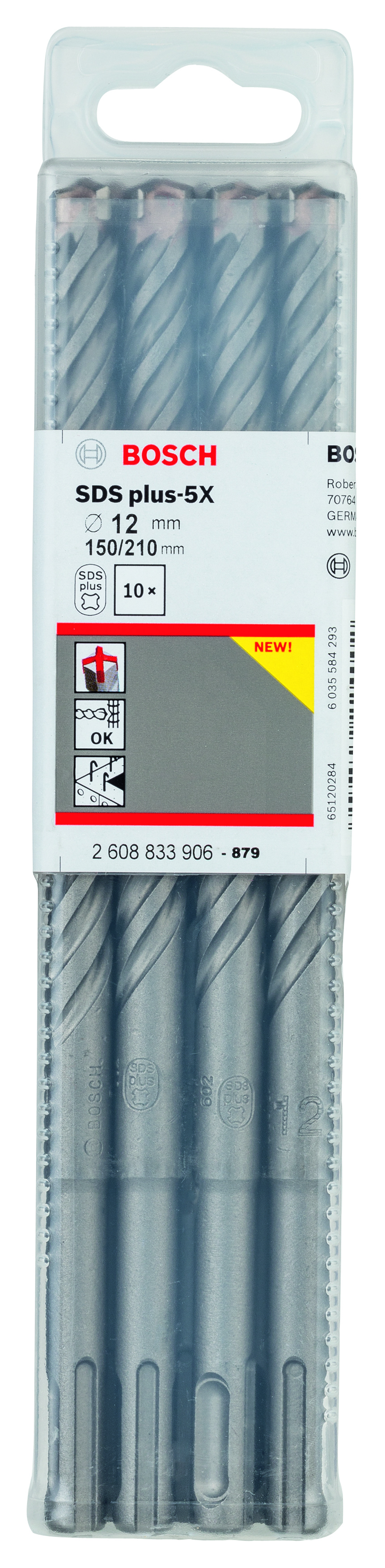 Emballage: 10Marque: BoschRéférence: 2608833906EAN: 6949509224002Description: 10 Foret bet PRO SDS plus-5X 12x150x210 mm