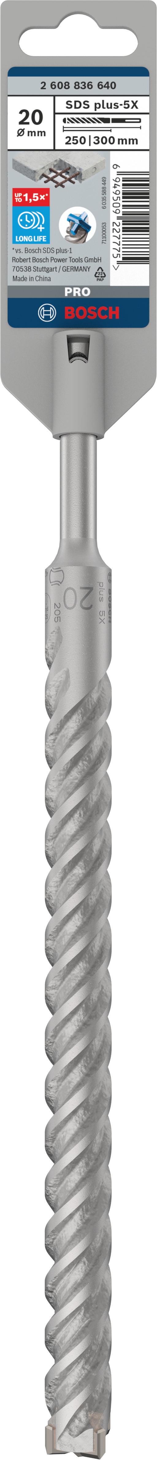 Emballage: 1Marque: BoschRéférence: 2608836640EAN: 6949509227775Description: Foret beton PRO SDS plus-5X 20x250x300 mm