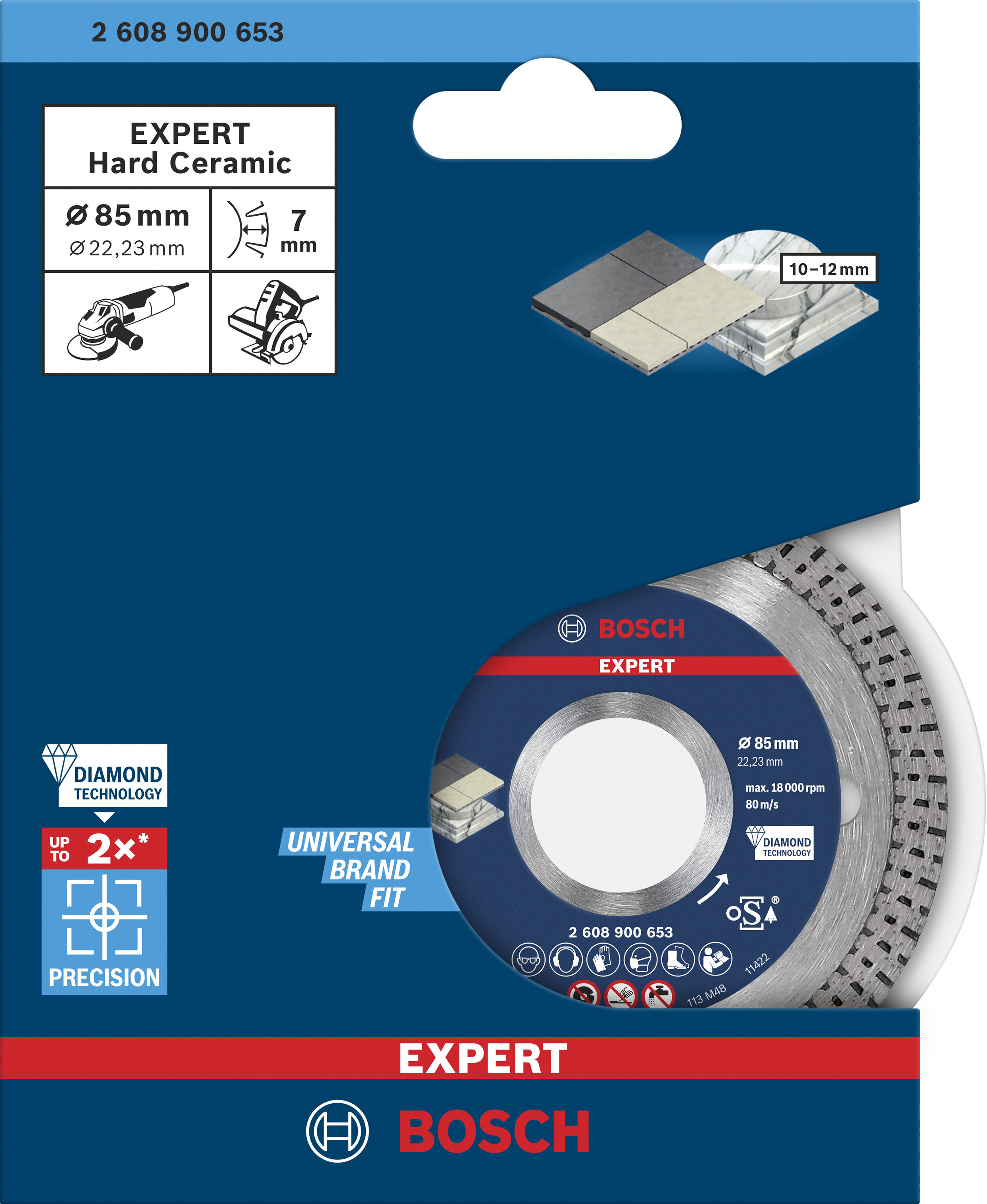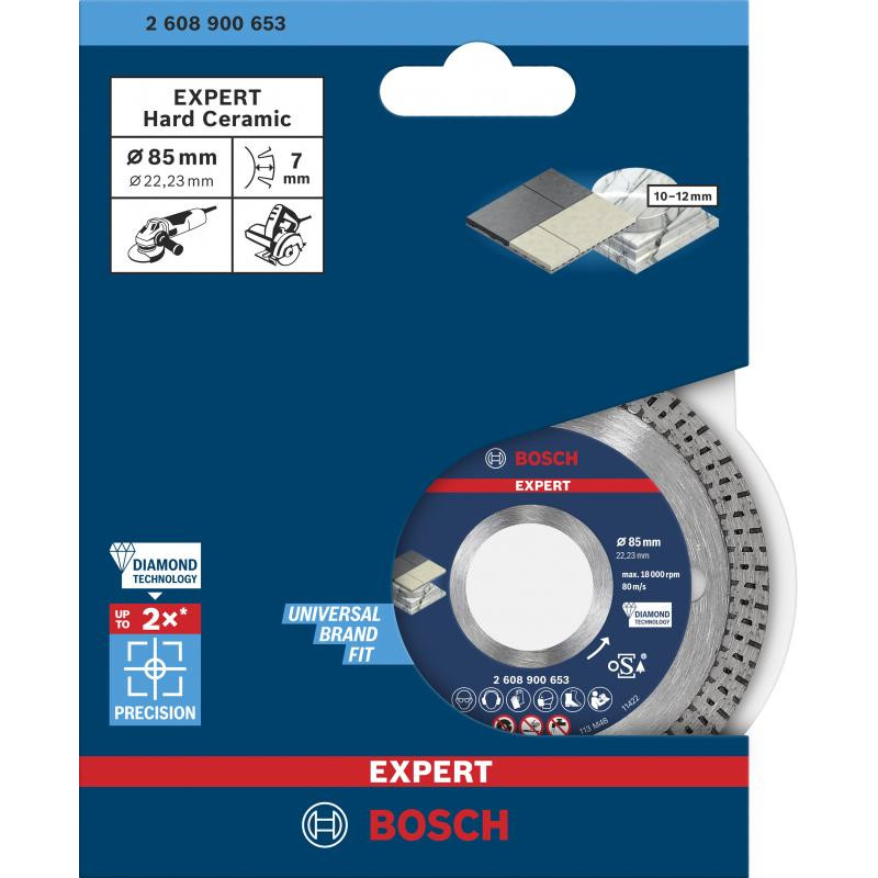 Emballage: 1Marque: BoschRéférence: 2608900653EAN: 4059952539881Description: EXPERT Disque diamanté HardCeramic 85 x 22,23 x 1,6 x 7 mm