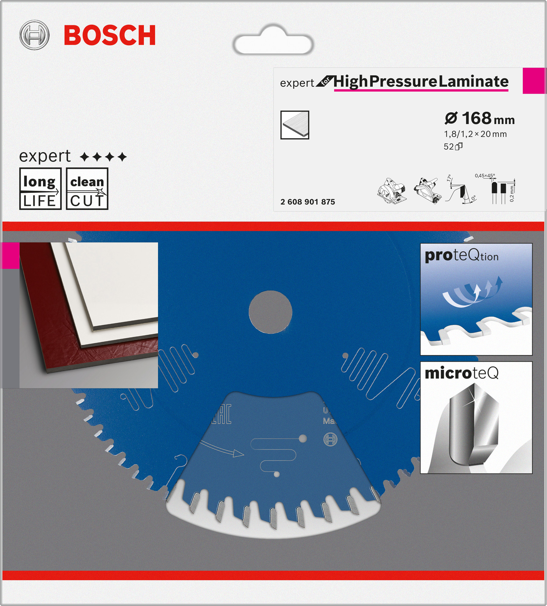 Emballage: 1Marque: BoschRéférence: 2608901875EAN: 4059952678139Description: Lame de Scie Circulaire Expert for High Pressure Laminate 168x20x1,8/1,2 mm, T52