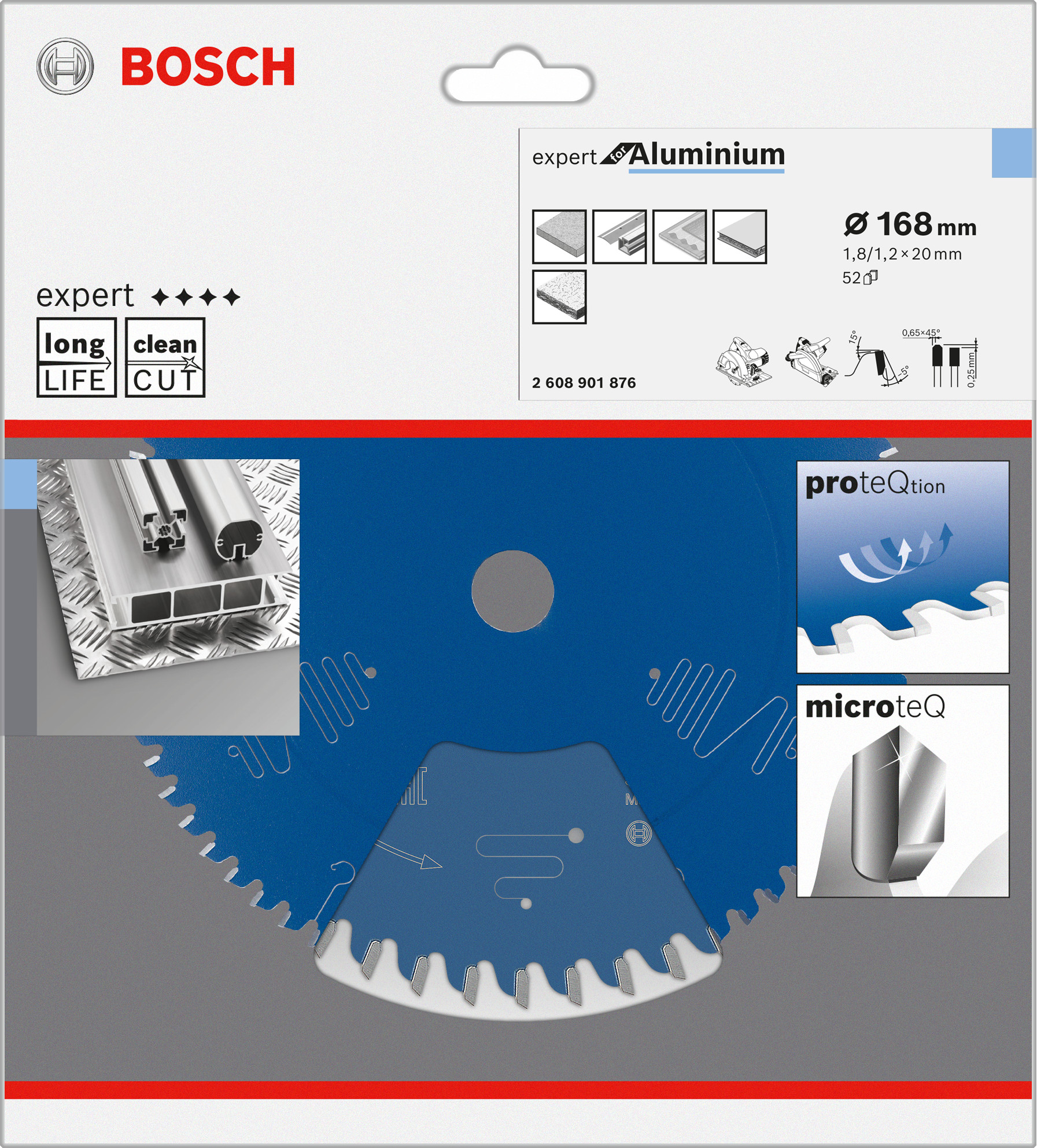 Emballage: 1Marque: BoschRéférence: 2608901876EAN: 4059952678146Description: Lame de Scie Circulaire Expert for Aluminium 168x20x1.8/1.2x52T