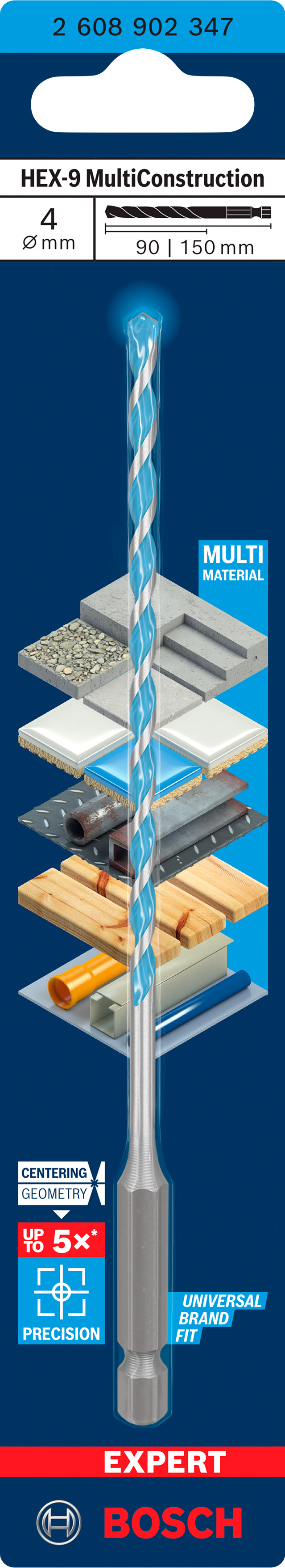 Emballage: 1Marque: BoschRéférence: 2608902347EAN: 6949509245380Description: EXPERT Foret polyvalent HEX-9 MultiConstruction 4x90x150