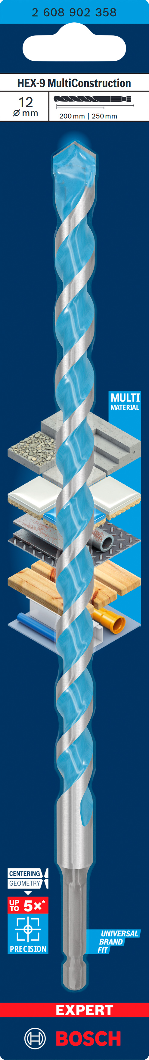 Emballage: 1Marque: BoschRéférence: 2608902358EAN: 6949509245496Description: EXPERT Foret polyvalent HEX-9 MultiConstruction 12x200x250