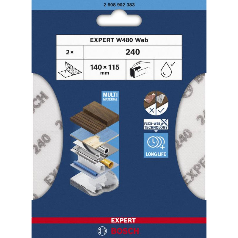 Emballage: 2Marque: BoschRéférence: 2608902383EAN: 4059952696478Description: EXPERT Fueille abrasif Web W480 115 x 140 mm, G240, 2x