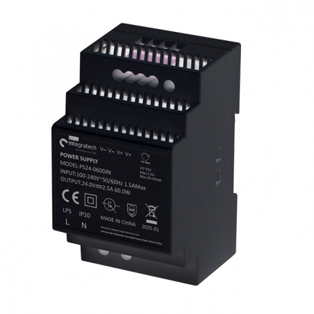 Emballage: 1 - 50Marque: IntegratechRéférence: PS24-060DINEAN: 5404042515884Description: Alimentation 24VDC 60W sur rail DIN