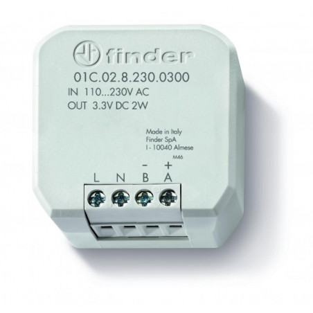 Emballage: 5Marque: FinderRéférence: 01C0282300300EAN: 8012823434223Description: Alimentation externe pour Bliss, 110230 VAC/ 3,3VDC, 2W