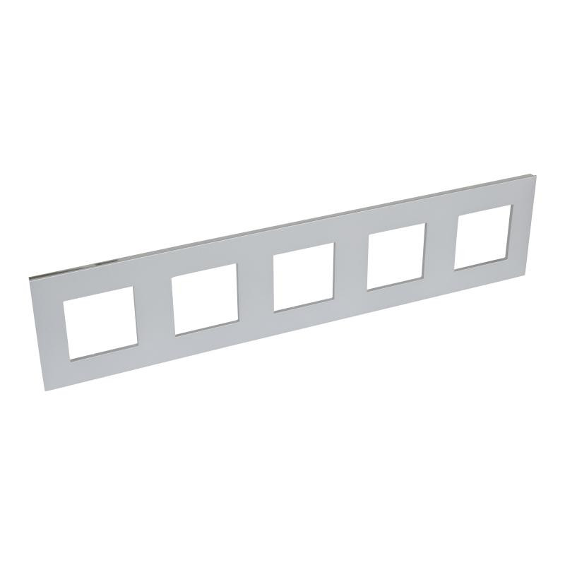 Emballage: 1 Marque: LegrandRéférence: 741145EAN: 3414971275157Description: VALENA NEXT plaque 5 postes hor/vert entraxe 71mm alu chrome