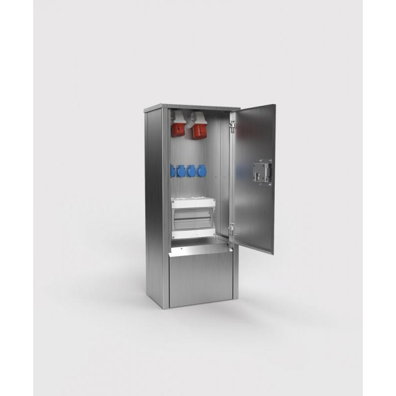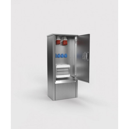 Description: COLONNE D'ÉNERGIE EST24 - 6 MODULES (4X UTE + 1X CEE 5/16A 400V + 1X CEE 5/32A 400V + 2X 1P 16A CB + 1X 3P 16A CB + 1X 3P 32A CB + 1X 40-AMP-RCD), ACIER INOXYDABLE BROSSÉ
