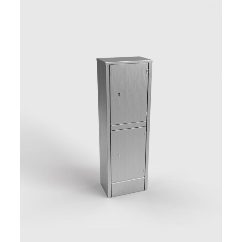 Description: COLONNE D'ÉNERGIE EST25 - 12 MODULES (4X UTE + 1X CEE 5/16A 400V + 1X CEE 5/32A 400V + 1X CEE 5/63A + 2X 1P 16A CB + 1X 3P 16A CB + 1X 3P 32A CB + 1X 3P 63A CB + 1X 60-AMP-RCD), ACIER INOXYDABLE BROSSÉ