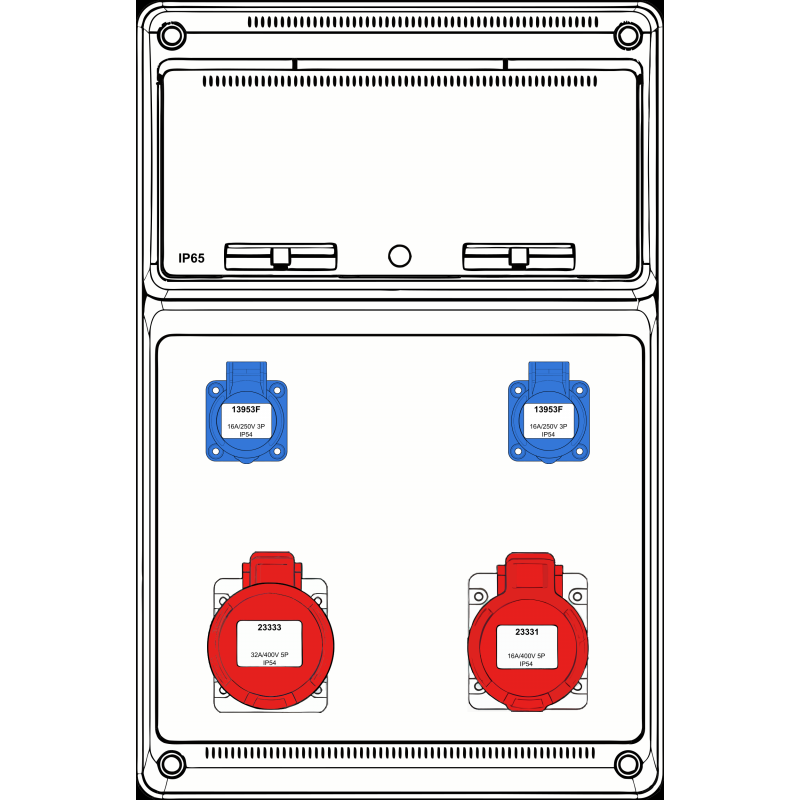 Description: BOÎTE MURALE COMBI LARGE - 1X 16A 5P 400V + 1X 32A 5P 400V + 2X MONO 230V - INT + DISJ (2) - 10KA