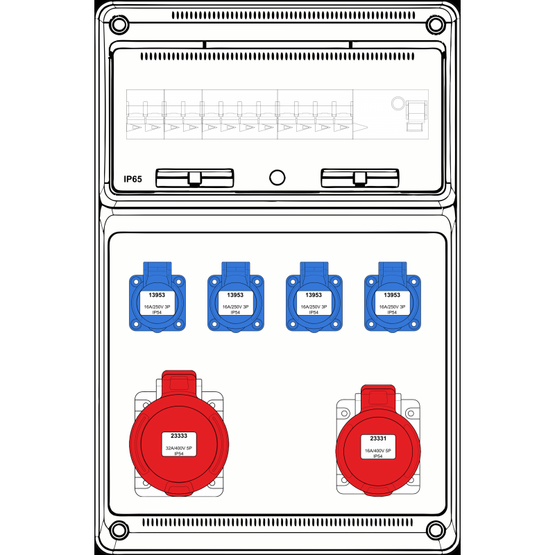 Description: BOÎTE MURALE COMBI LARGE - 1X 16A 5P 400V + 1X 32A 5P 400V + 4X MONO 230V - INT + DISJ (4) - 10KA