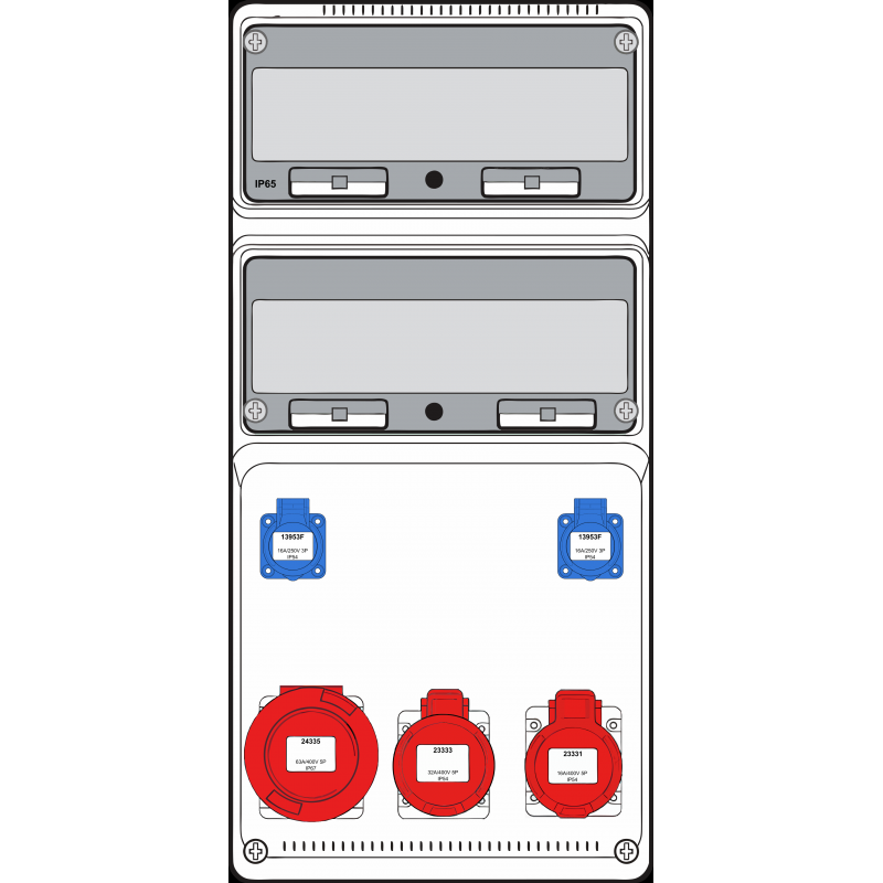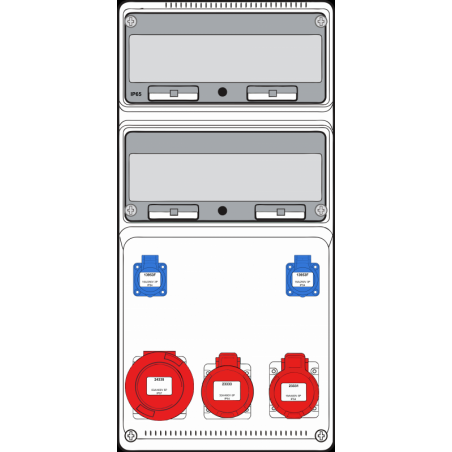 BOÎTE MURALE COMBI XLARGE -1X 16A 5P 400V + 1X 32A 5P 400V + 1X 63A 5P 400V + 2X MONO 230V - INT + DISJ (4) - 10KA