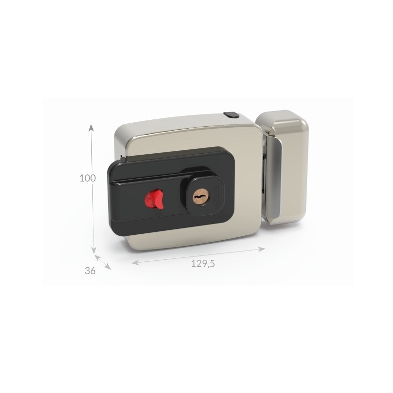 Description: SÉRIE CE - SERRURE MOTORISÉE APPARANTE (8-12V AC/DC) AVEC BOUTON-POUSSOIR MÉCANIQUE ET SERRURE À CYLINDRE POUR LE DÉVERROUILLAGE