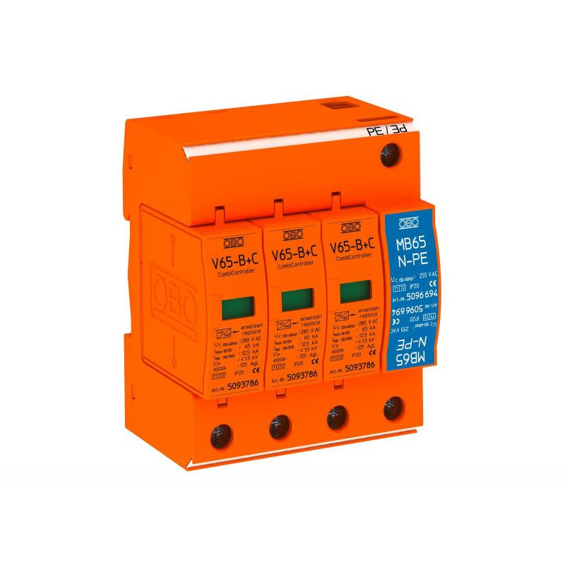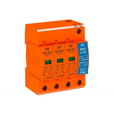 Emballage: 1 - 24 Marque: OBORéférence: 5093751EAN: 4012195694960Description: Parafoudre combiné V65 3 pôles + NPE