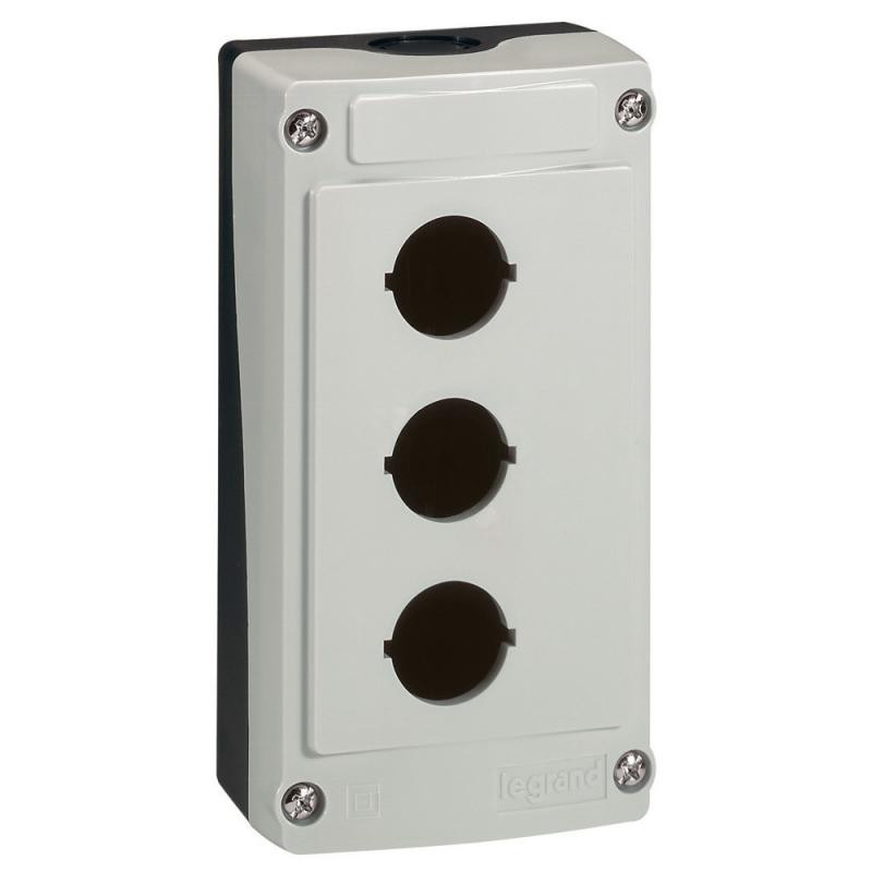 Description: Boîte à boutons vide OSMOZ - 3 trous - gris - possibilité de monter 3 blocs par trou - pr têtes de commande et de signalisation lumineuses ou non lumineuses - IP 66