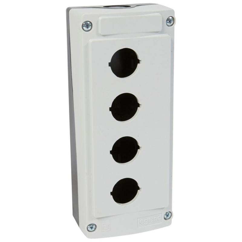 Description: Boîte à boutons vide OSMOZ - 4 trous - gris - possibilité de monter 3 blocs par trou - pr têtes de commande et de signalisation lumineuse ou non lumineuses - IP 66