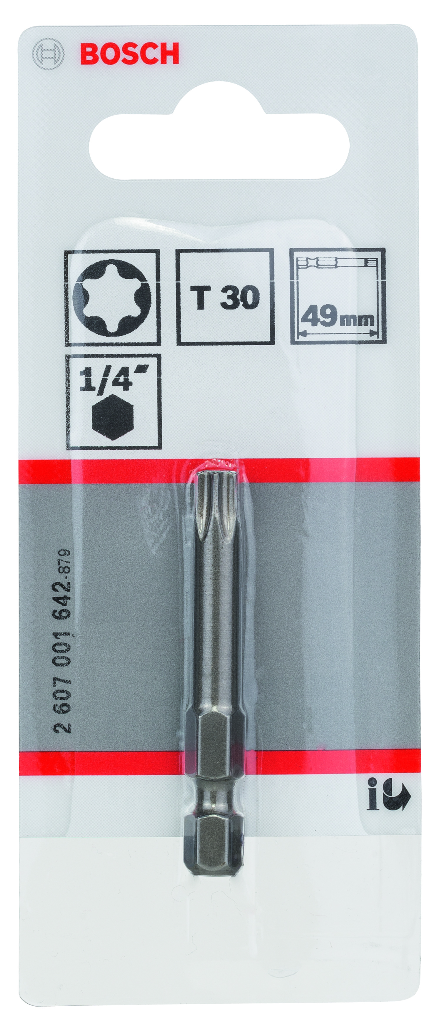 Emballage: 1Marque: BoschRéférence: 2607001642EAN: 3165140301688Description: Embout de vissage extra-dur T30, 49 mm