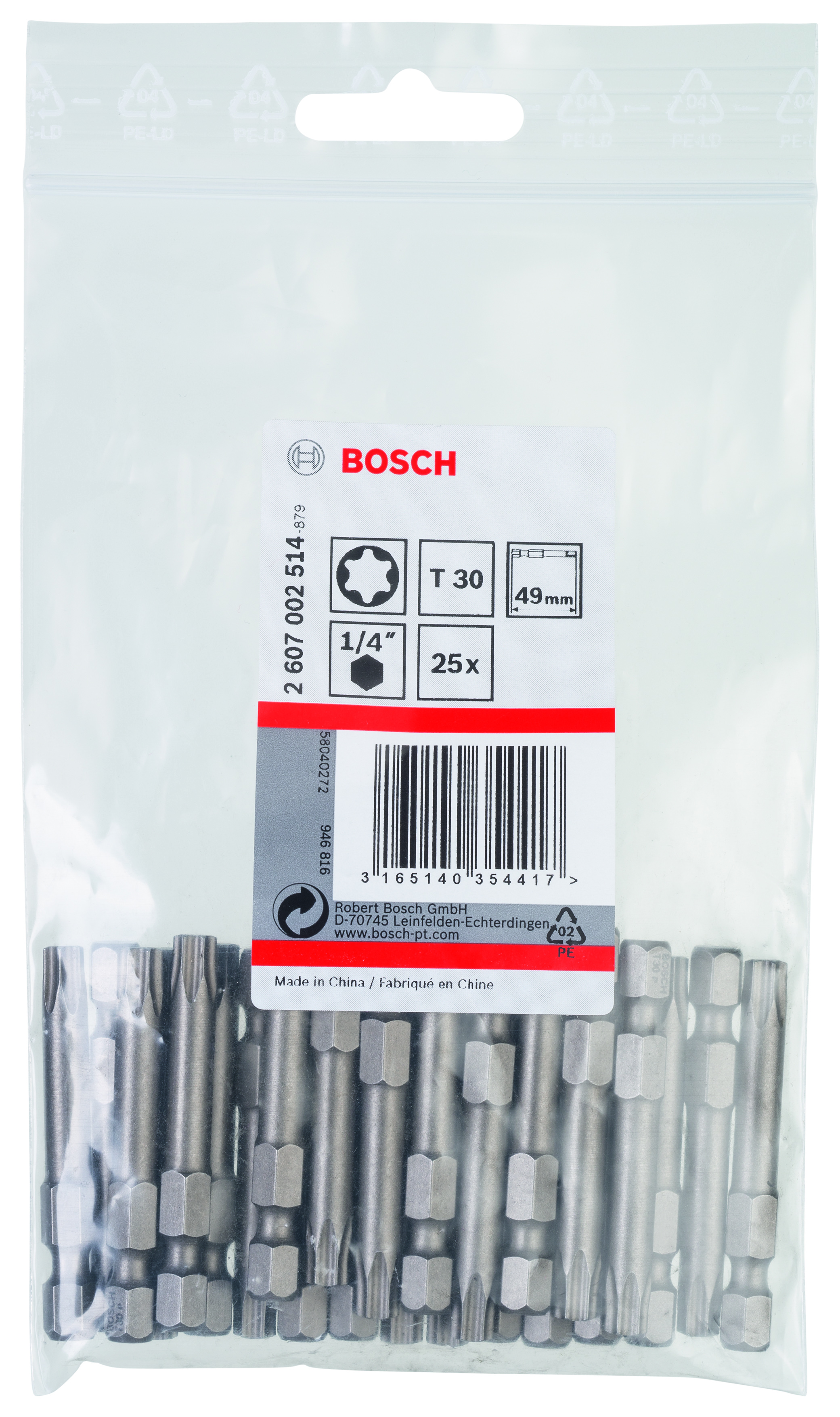 Emballage: 25Marque: BoschRéférence: 2607002514EAN: 3165140354417Description: Embout de vissage extra-dur T30, 49 mm 25x