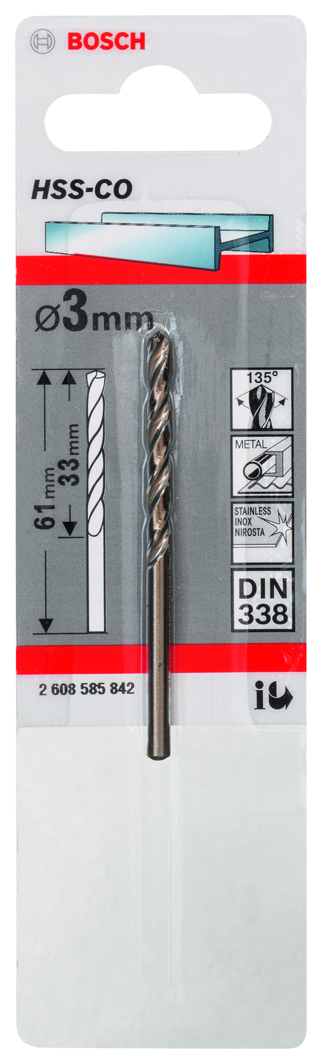 Emballage: 1Marque: BoschRéférence: 2608585842EAN: 3165140520775Description: Foret à métaux rectifiés HSS-Co, DIN 338, 3 x 33 x 61 mm