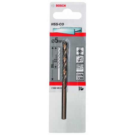 Emballage: 1Marque: BoschRéférence: 2608585851EAN: 3165140520867Description: Foret à métaux rectifiés HSS-Co, DIN 338, 5 x 52 x 86 mm